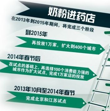 从酝酿到实施,“奶粉进药店”新政始终不被业内人士看好。图为奶粉进药店三个阶段。(CFP/图) 相比超市、母婴店和网络销售渠道,被誉为国内奶粉销售的“第四渠道”—药店,在奶粉质量和价格两